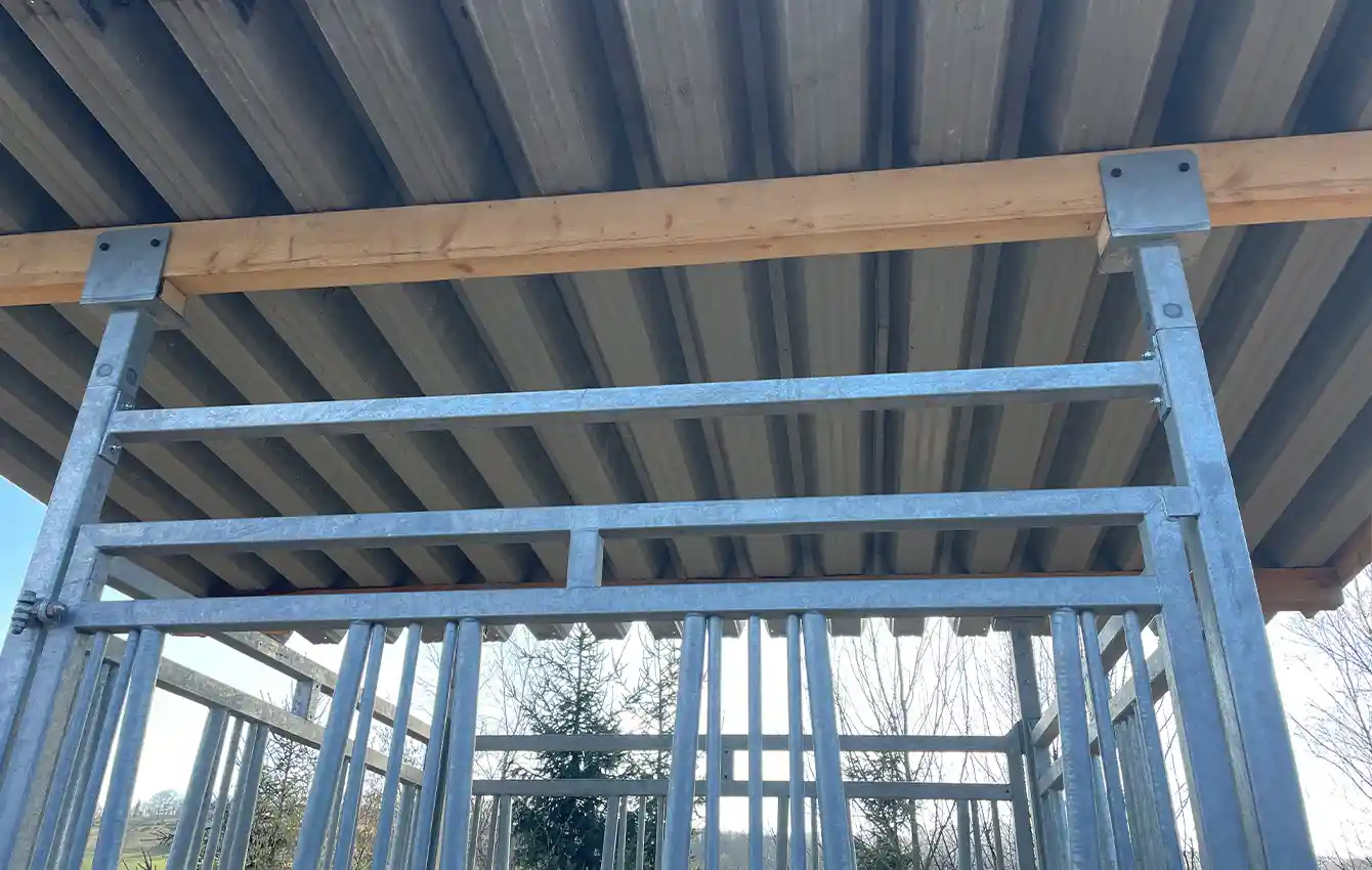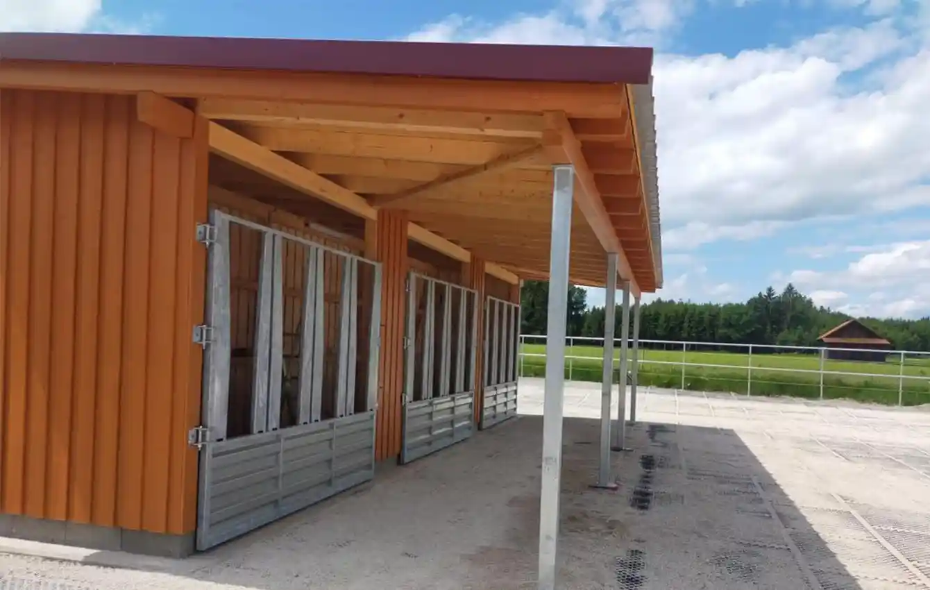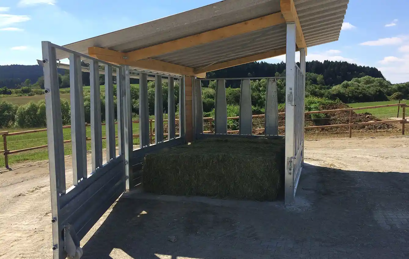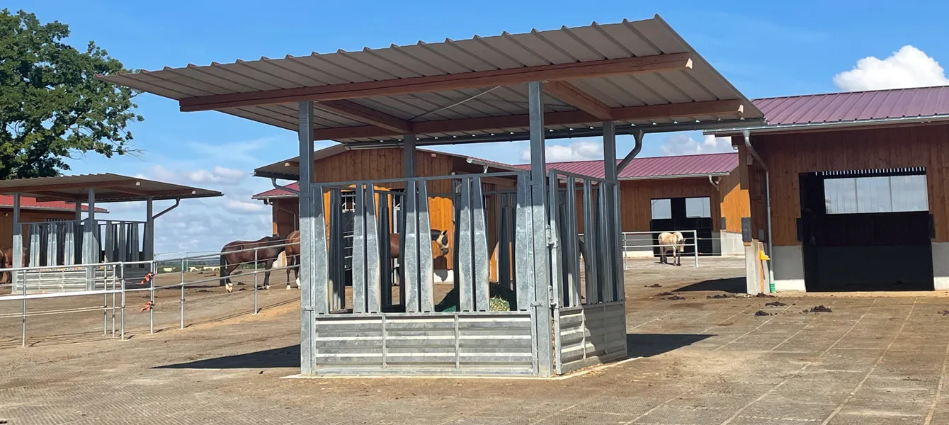 In addition to the safety-oriented feed grille design, generous roof overhangs can be added so that horses remain dry and protected from the weather while eating.