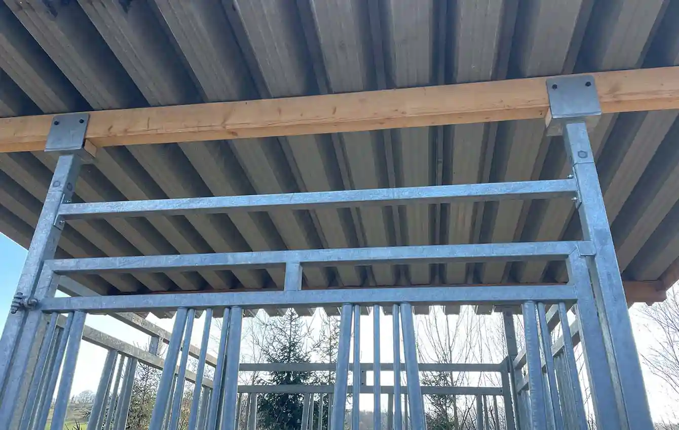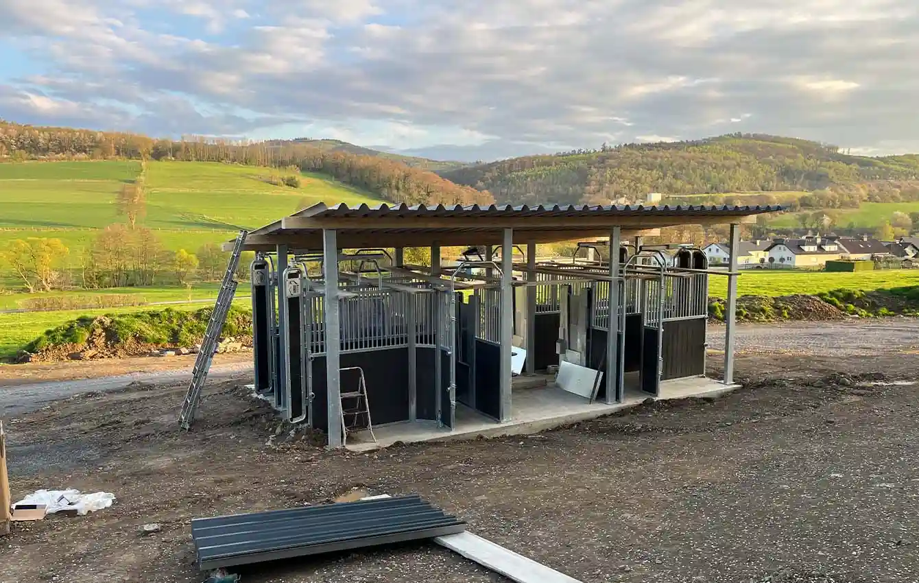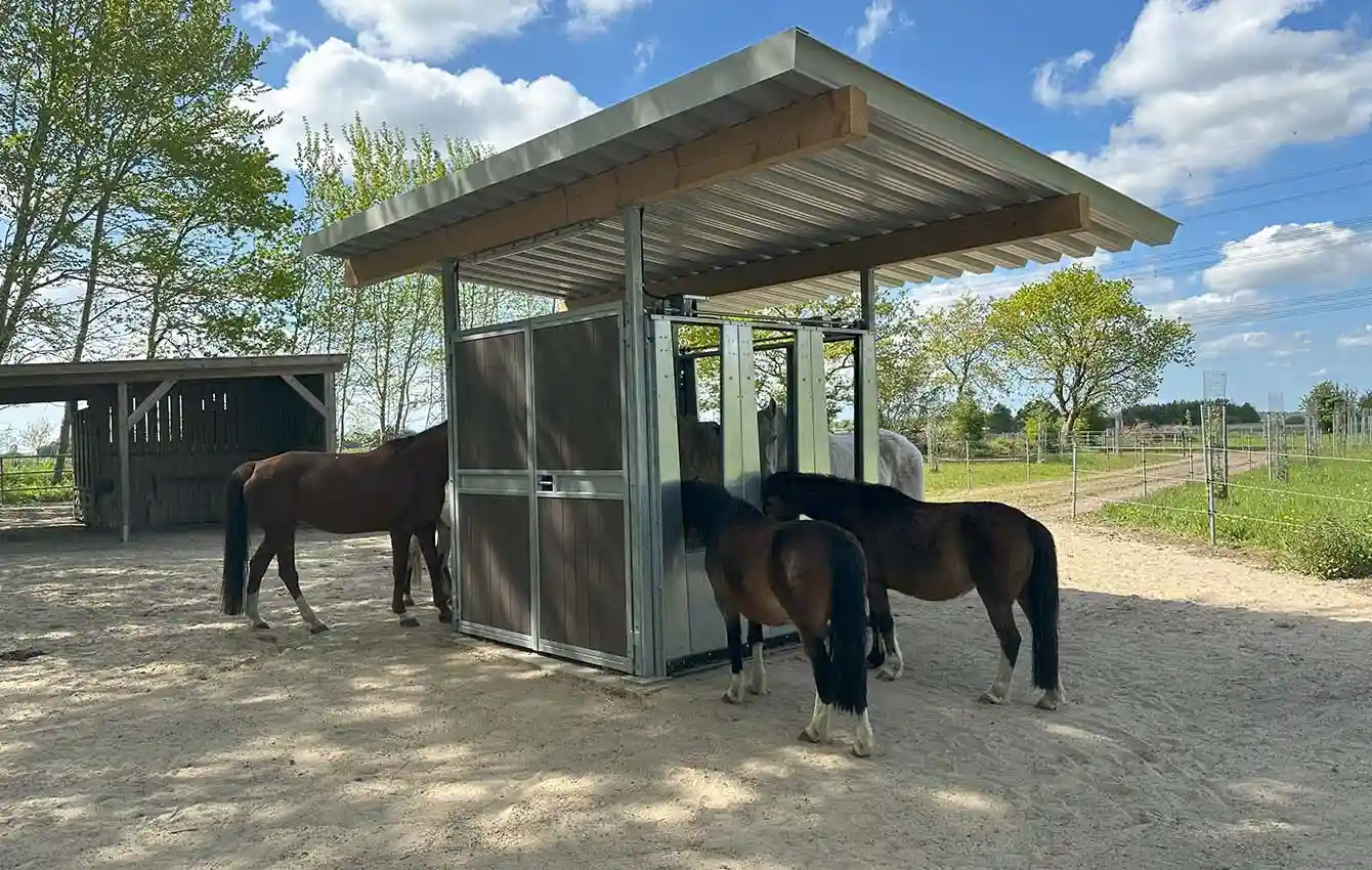 To make it as easy as possible for horse owners to construct roofing for the time-controlled hay dispensers, transponder-controlled feeding stations and selection gates, as well as hay racks, HIT-Aktiv offers dedicated roof supports and gates for this purpose.